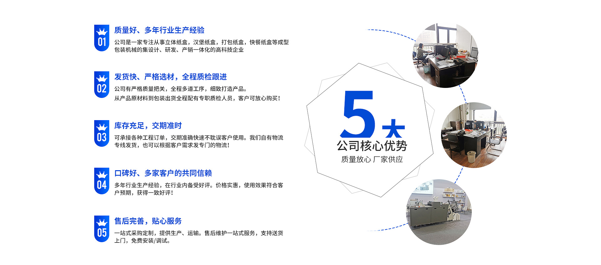 瑞安市中法機械有限公司是一家從事立體紙盒機,漢堡紙盒機,打包紙盒機,快餐紙盒機等成型包裝機械的設計、研發(fā)、產銷一體化的高科技企業(yè)。公司有現代化的管理體系和完善的售后服務體系;有一支具有充滿青春活力的精銳研發(fā)團隊!自成立以來,中法公司堅守“誠信、學習、發(fā)展”的企業(yè)發(fā)展理念,堅持“以誠信為道、以質優(yōu)取勝”的經營原則,在市場競爭中取得了良好的社會和經濟效益!